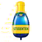 Folieballong formad som en champagneflaska med texten Studenten tryckt på framsidan. Ballongen kan fyllas med luft eller helium och har en hangtab för enkel upphängning med snöre. Snöre ingår ej. Populärt studentpynt och studentballong till examensfirandet.