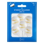 Vita latexballonger med texten Grattis till studenten i guld samt en liten studentmössa som motiv. Ballongerna kan fyllas med antingen luft eller helium. Förpackningen innehåller sex stycken ballonger.