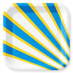 Förpackningen innehåller vita pappmuggar dekorerade med diagonala ränder i blått och gult. Student muggar i papp som passar utmärkt till dukning vid examensfirande eller sommarfester.