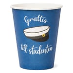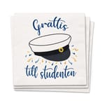 Studentdukning med papperstallrikar i vitt och blått, dekorerade med studentmössa och gratulationstext. Engångstallrikar som säljs i flerpack, enkla att kombinera med övrig festdukning för en sammanhållen look på firandet.
