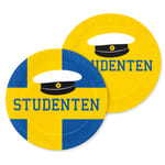 Runda papperstallrikar med svensk flagga som bakgrund och en studentmössa ovanför texten Studenten. Dessa student engångstallrikar säljs i 8-pack och passar till studentdukning vid mottagning eller fest.