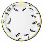 Mössorna flyger fritt över servetten som om någon just kastat dem i luften efter avslutningsceremonin. Den blågula kanten ramar in kaoset och påminner om att vissa traditioner aldrig blir tråkiga, särskilt inte när de landar mitt i tårtsmulorna på dukningen.