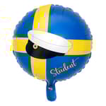 Folieballong i rund modell med studentmössa och svensk flagga som motiv. Kan fyllas med både luft och helium. Ballongen har självförslutande ventil. Perfekt studentdekoration och studentpynt till studentfesten.